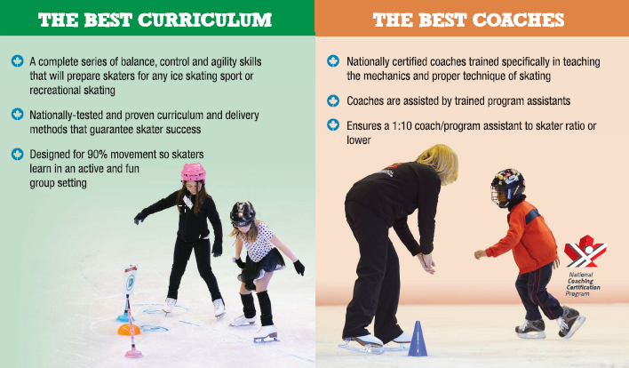 Action, movement and fun! Lessons are given in a group format with a coach-to-student ratio of a maximum 1:10. Skaters progress at their own rate and coaches make sessions active using teaching aids, upbeat music and a wide variety of activities that create a motivational environment and promote learning. Badges, ribbons and other incentives are used to benchmark skaters’ progress and reward effort and participation.